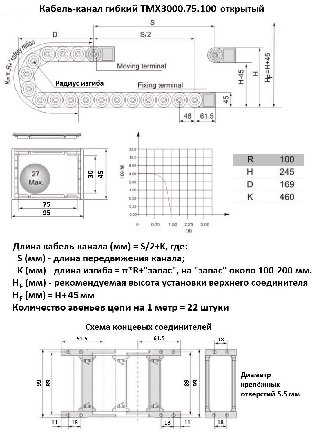 Канал 30x75-R100 открытого типа, звенья открываются внутрь и наружу от изгиба. Звенья буксируемой цепи можно разъединять и соединять, получая нужную длину системы перемещения.