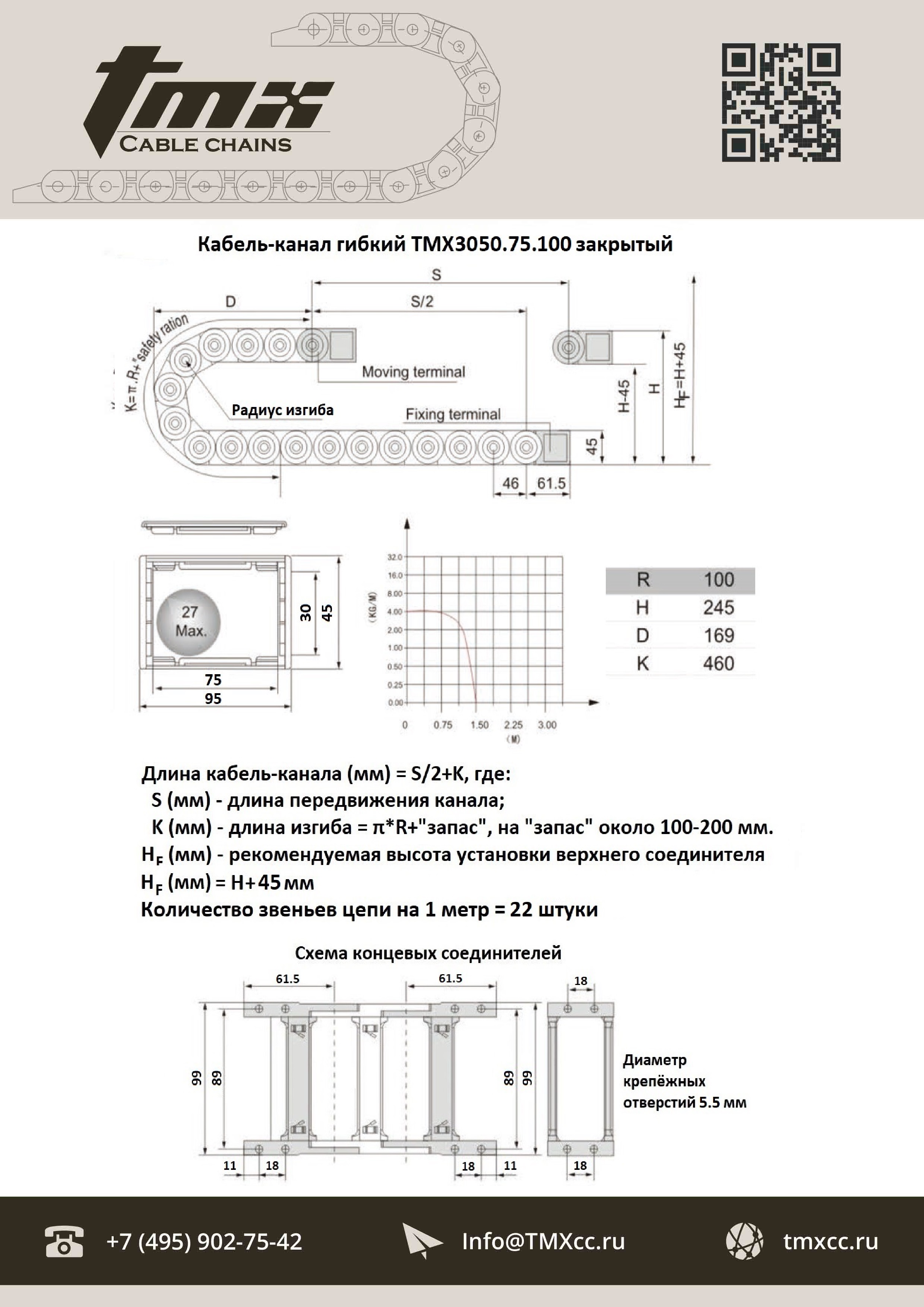 Канал 30x75-R100 закрытого типа, звенья открываются внутрь и наружу от изгиба. Звенья буксируемой цепи можно разъединять и соединять, получая нужную длину системы перемещения.